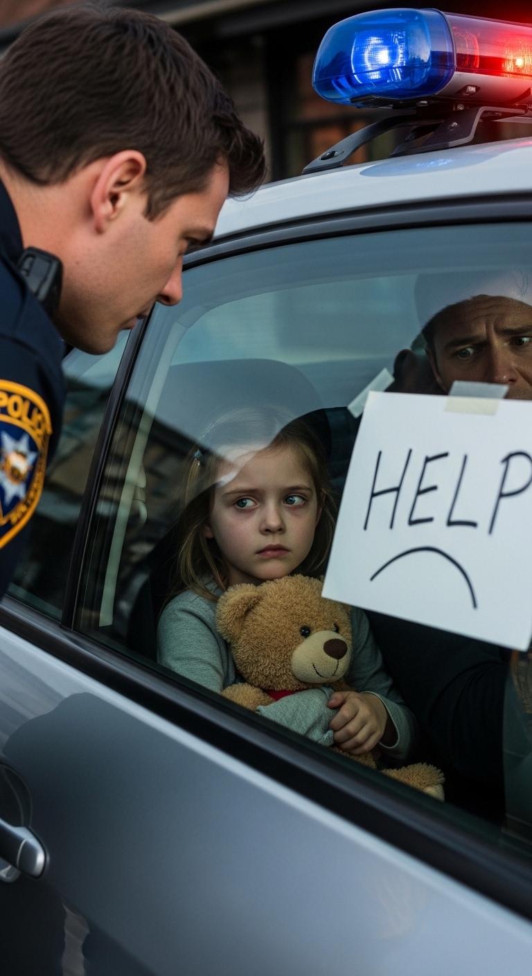 I leaned just enough to look past him. The back seat held a little girl, maybe four or five, strapped into a booster seat. Dark curls. Pale skin. A pink jacket with cartoon rabbits. She held a teddy bear so tightly her knuckles bleached white.