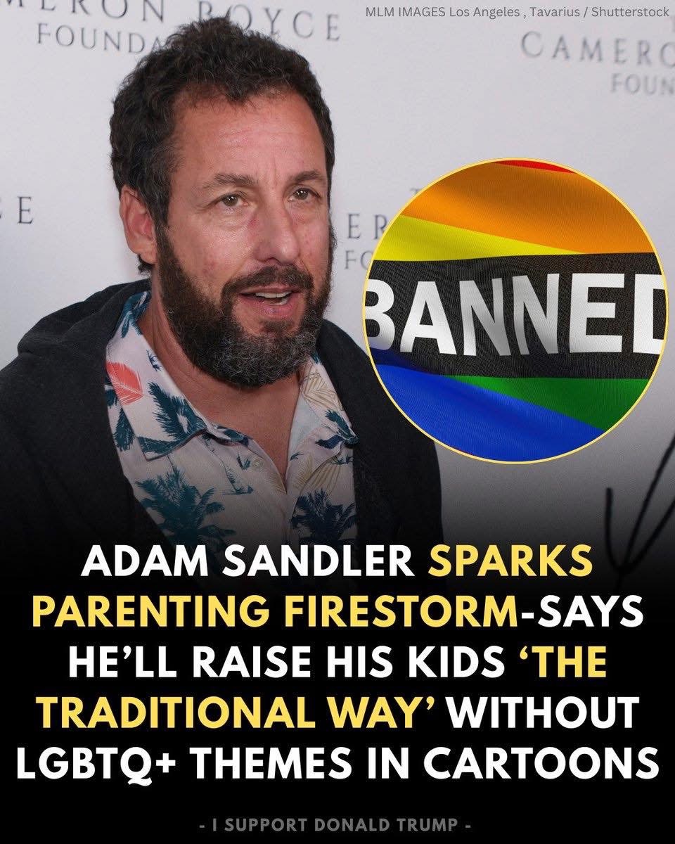 According to recent reports circulating online, Sandler has expressed that he intends to raise his children the “traditional way,” choosing to limit exposure to LGBTQ+ themes in cartoons and youth entertainment. The reaction was immediate. Supporters applauded. Critics pushed back. Social media lit up.