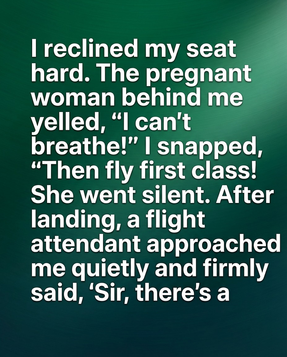 “Sir,” she said softly, leaning closer. “The woman behind you was feeling quite unwell during the flight. She has a condition that makes the restricted airflow from a reclined seat genuinely difficult for her. She didn’t want to make a fuss, but small gestures—like not reclining—can really help passengers like her.”