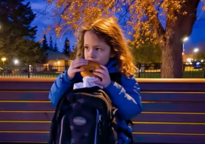 I was walking home from work with a grocery bag swinging against my hip when I first saw her—a little girl sitting alone on a bench near the corner store. It was already dark, the street quiet, the air smelling like wet leaves and wood smoke. She couldn’t have been more than seven. Tiny thing. Hair tangled, hoodie too thin for the cold, backpack slipping off one shoulder.