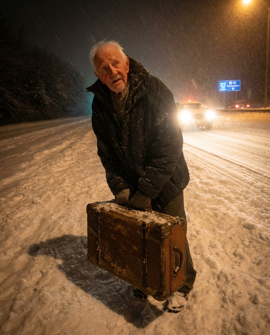 He was walking along the shoulder of the highway, hunched against the cold, dragging a battered suitcase behind him as if it weighed more than he did. His steps were slow, deliberate, the kind that come from stubborn determination rather than strength. He looked painfully out of place against the storm, like someone the world had simply forgotten.