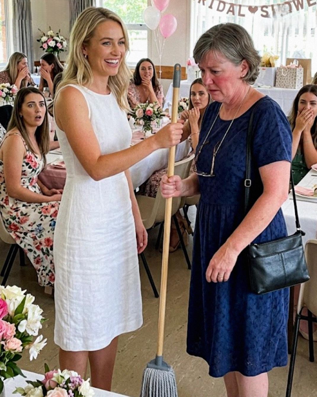 Then she walked to the catering area, grabbed a mop, and brought it straight to me.
