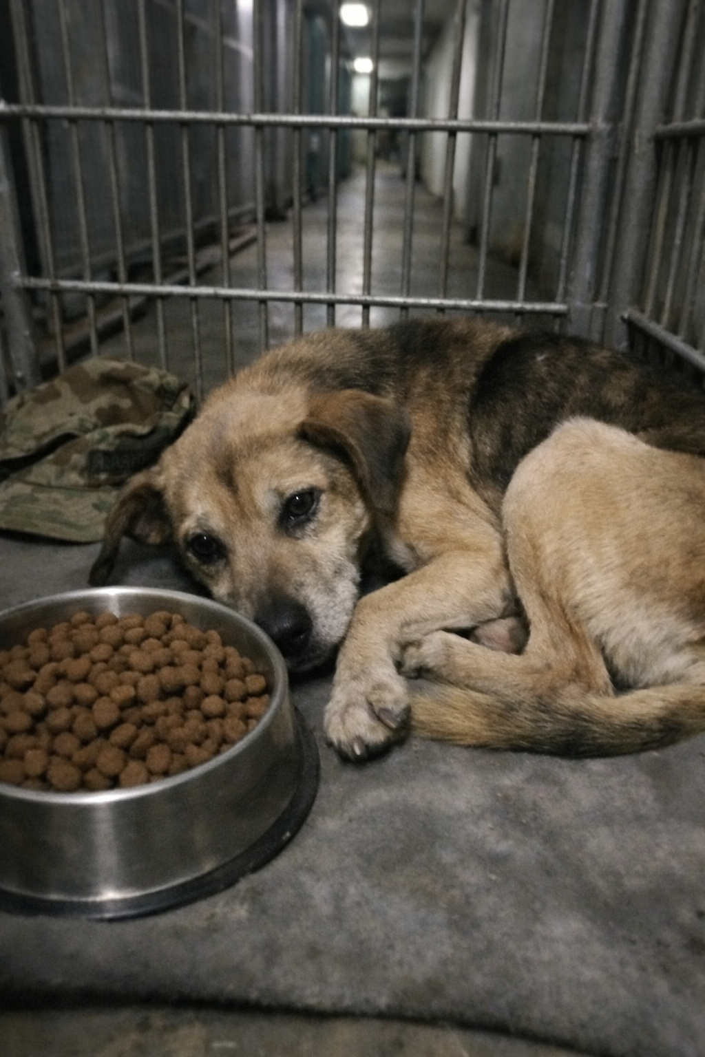 Behind him, in the shadows of the kennel, lay a folded military cap, old and frayed, tucked carefully into the corner like it belonged there.