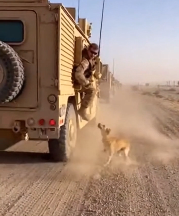 A white American sergeant in his late 30s leaned out the window, helmet tilted, eyes wide. The dog stumbled. Fell. Scrambled back up. His legs shook but he didn’t stop.