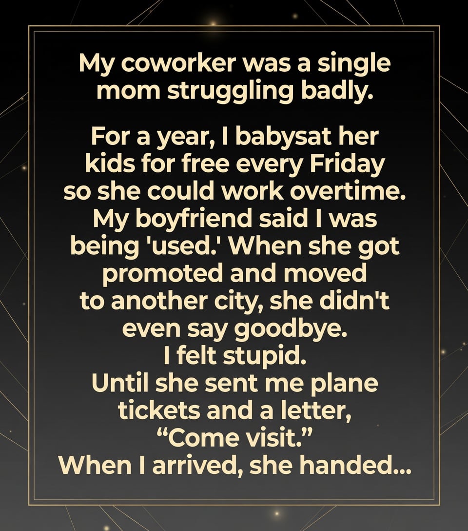 I tried to turn them down, the old habit of saying “it was nothing” coming to my lips, but she looked at me in a way that insisted I listen. She explained that those Friday nights weren’t just about childcare. They were the engine of her success. Because I had offered a secure, free environment for her children, she was able to accept every difficult task, every late meeting, and every extra shift the office had. She had made herself essential to the company, eventually winning a promotion that included a relocation package and a salary that finally ended the cycle of poverty she had been stuck in.