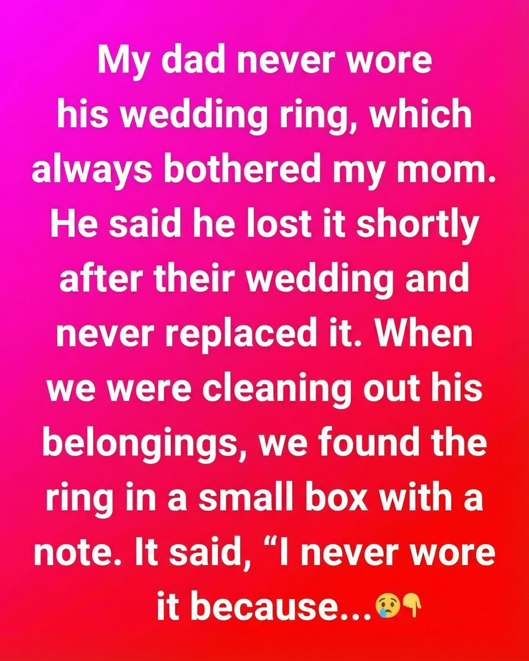 As my mom read the note, something in her face softened. Not grief, not confusion, but understanding. For years she’d lived with that faint sting of wondering why her husband never wore the symbol of their marriage. Now she saw that he hadn’t misplaced it. He’d preserved it. He’d taken care of it in the same quiet, humble way he took care of us. Every scraped knuckle, every cracked nail, every long day spent keeping our household afloat was woven into that decision.